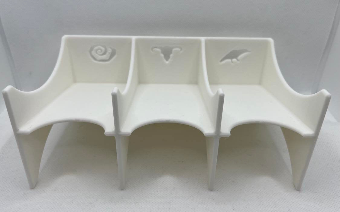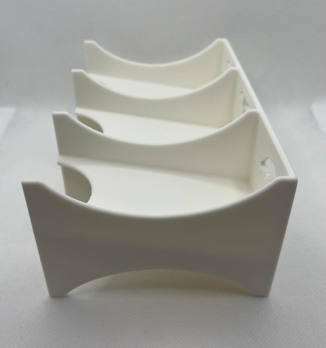 This card rack is 3D printed in PLA filament. We purchase our filament in bulk, so the color will be gray, white, or black, depending on what we have in stock. Other colors available upon request.